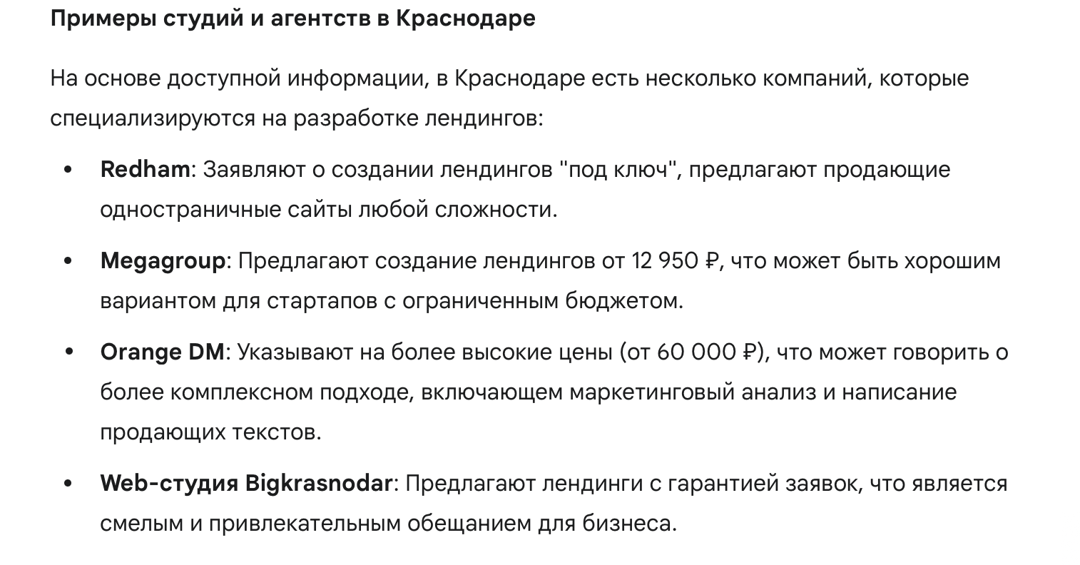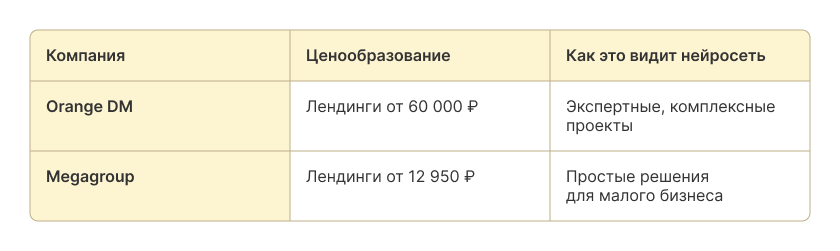 Рассмотрим наше агентство Orange DM. На сайте мы чётко указываем цену и поясняем, почему услуга стоит именно столько. Кроме того, регулярно публикуем кейсы с измеримыми результатами: рост трафика, количество заявок, ROMI. Эти данные дублируем на профильные площадки, где нейросети могут их «увидеть» и сверить.