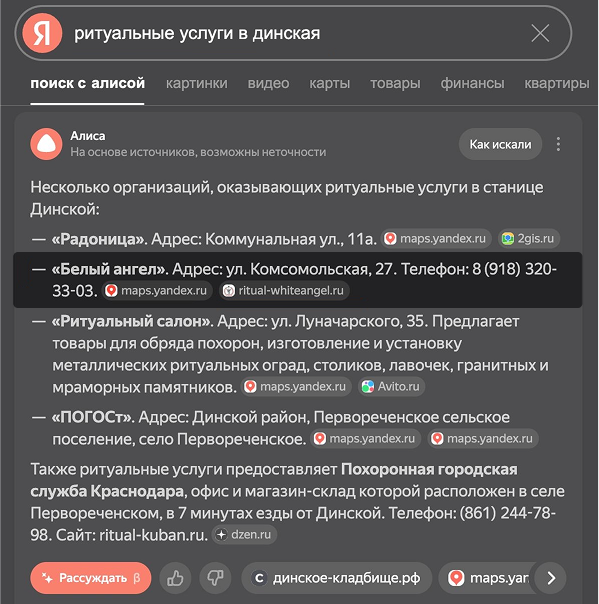 Ритуальное агентство «Белый ангел». Для этого клиента мы оформили кейс на платформе TenChat: описали задачу, этапы и результаты. На сайте компании вынесли на первый экран ключевые числа — стоимость услуг, режим работы, стаж. Через несколько недель бренд стал появляться в коротких ответах Яндекс.Алисы и в карточках организаций.