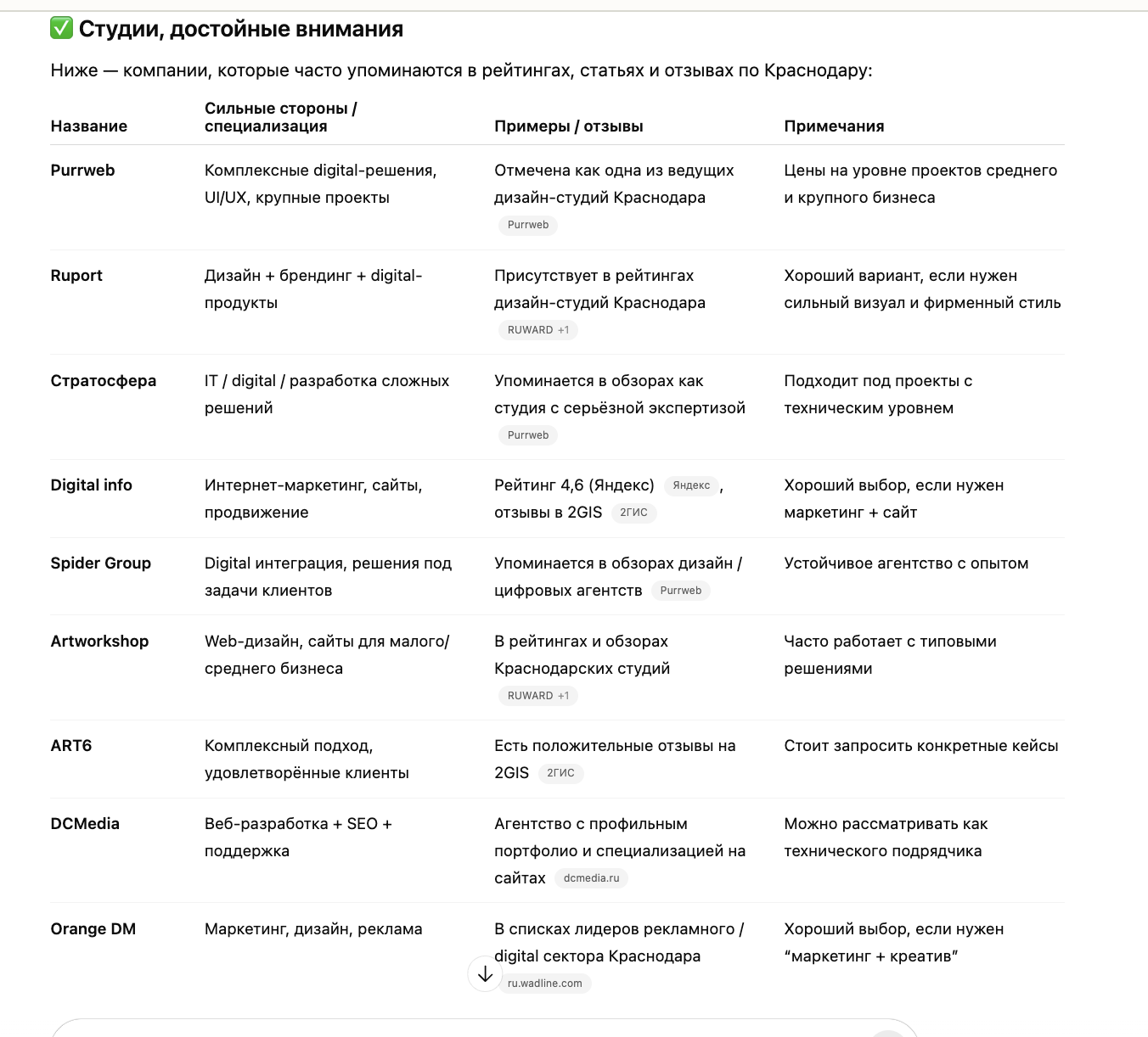 Рейтинги вроде RUWARD, Wadline и сервисы карт выполняют ту же роль. Если сайт упоминается в таких каталогах или имеет высокий рейтинг в картах, вероятность попасть в короткие ответы возрастает. Особенно по конкурентным запросам вроде «лучшее агентство». Даже при равных SEO-показателях выше оказывается тот, кто подкрепляет контент цифрами, кейсами и отзывами.