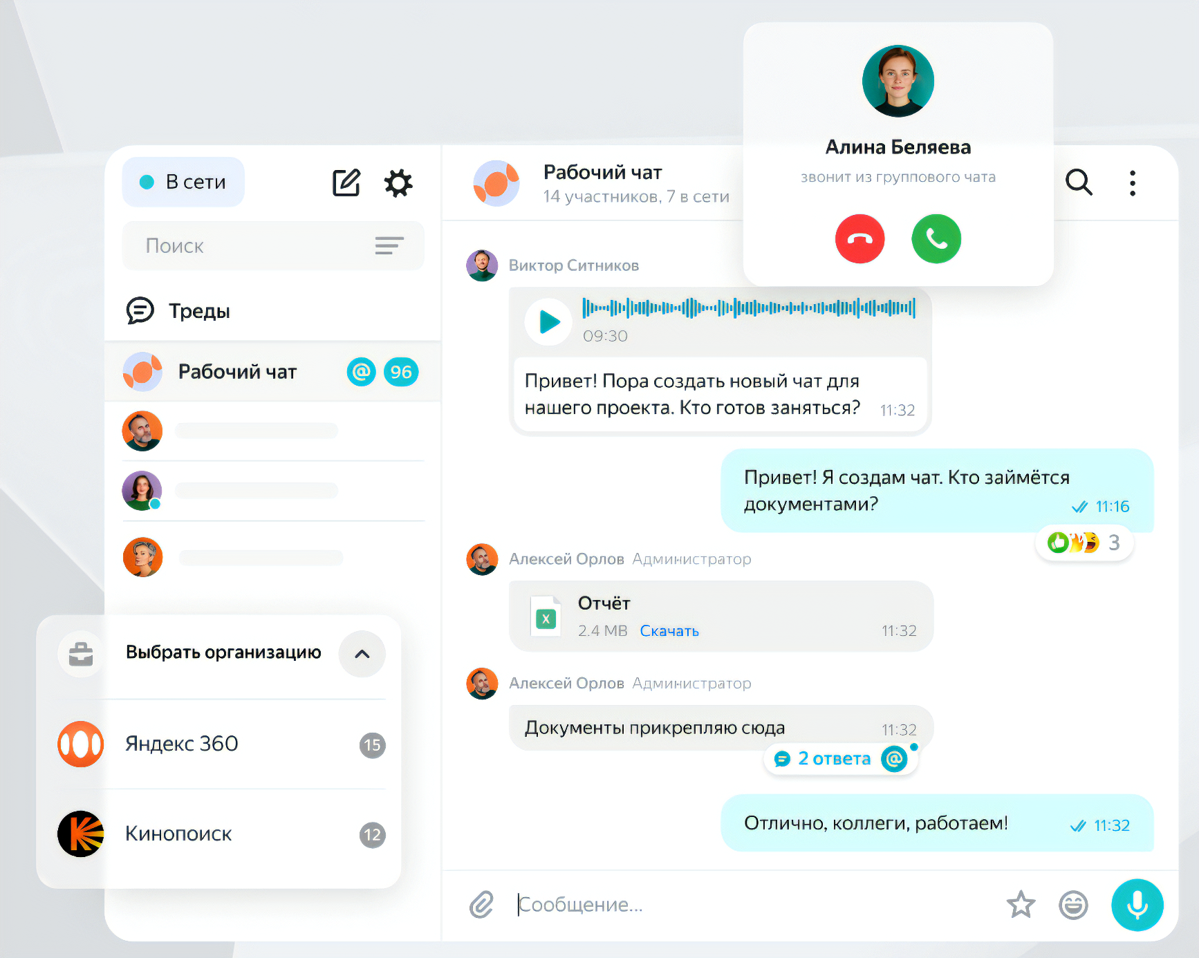 Это корпоративный мессенджер, который входит в пакет «Яндекс 360» и тесно связан с другими сервисами Яндекса. Например, можно в одном окне проверять почту, планировать встречи в календаре и обмениваться файлами через Диск.