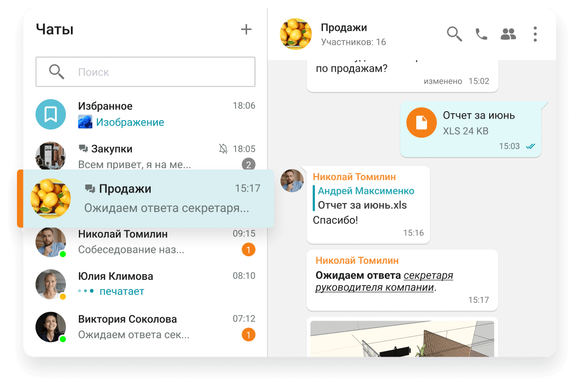 - Есть централизованное хранение: важные сообщения и файлы хранятся в одном месте и без ограничений по объёму. Переписка не удаляется со временем, а это удобно для долгосрочных проектов.