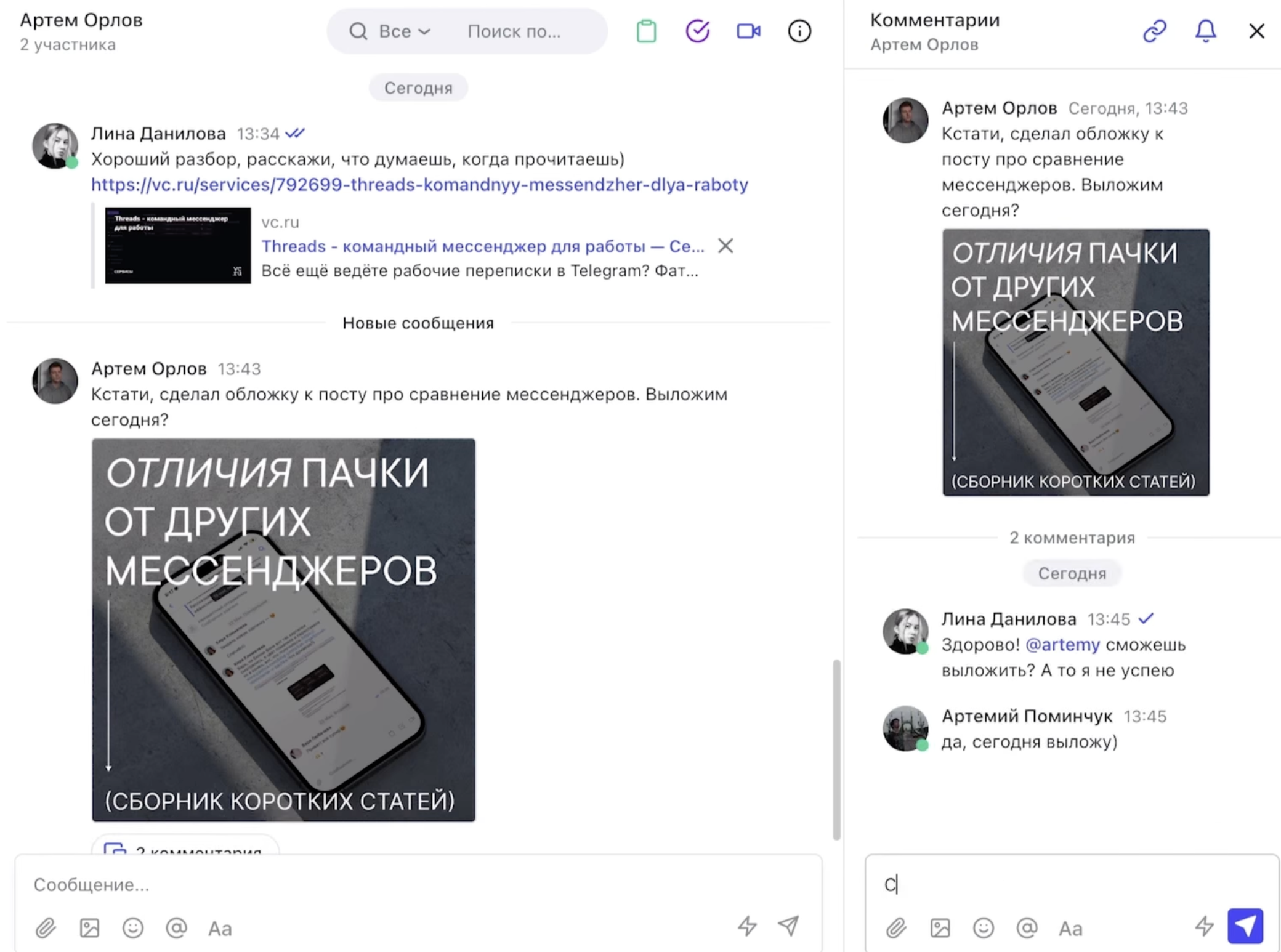 - Можно создавать тематические ветки сообщений — треды. Это отдельные обсуждения в чатах: первое сообщение становится темой, а все последующие ответы идут в виде комментариев. Так легче не терять важные сообщения в общем потоке.