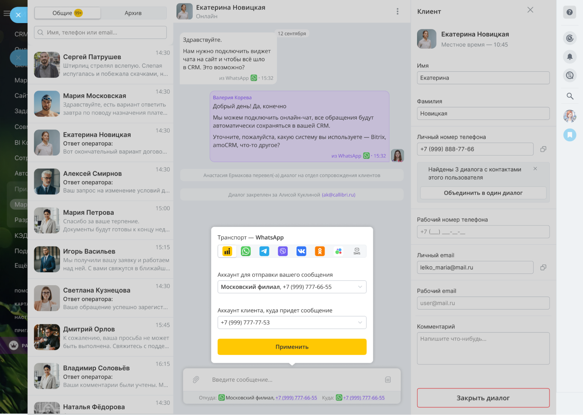 То же самое работает, если у каждого оператора отдельный профиль WhatsApp.Открываете диалог, отправляете сообщение — и оно уходит с того аккаунта, который использовался в прошлый раз.