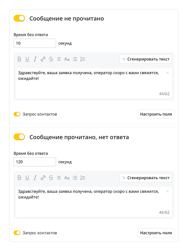 Автосообщения. Если оператор занят, система может отправить заранее настроенное сообщение — с запросом контактов или без него. Это помогает удержать клиентов в переписке и даёт возможность вести несколько диалогов одновременно — без потери вовлечённости.