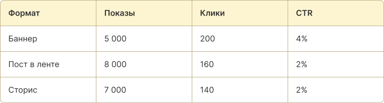 Получается, что кликабельность всей рекламной кампании составила 2,5%. При этом баннер работает лучше остальных форматов — его CTR в два раза выше среднего. Бизнесу стоит запускать его ещё больше или использовать похожие креативы.
