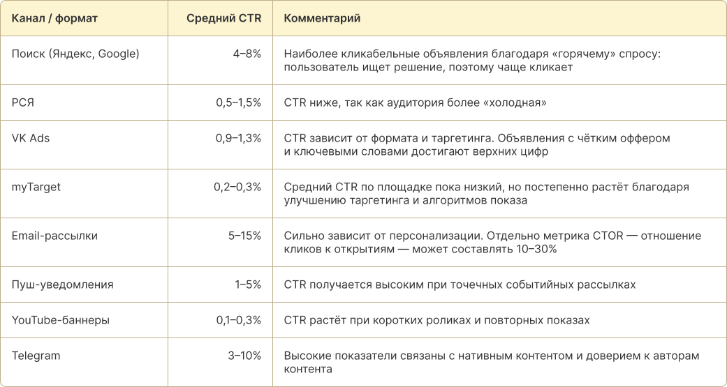 Нельзя назвать точные цифры по высокому и низкому CTR. Всё зависит от целей бизнеса, площадки и формата объявления. Один и тот же креатив может показать отличный результат в поиске, но провалиться в баннерах. Ниже — таблица со средними цифрами по основным каналам в 2025 году.