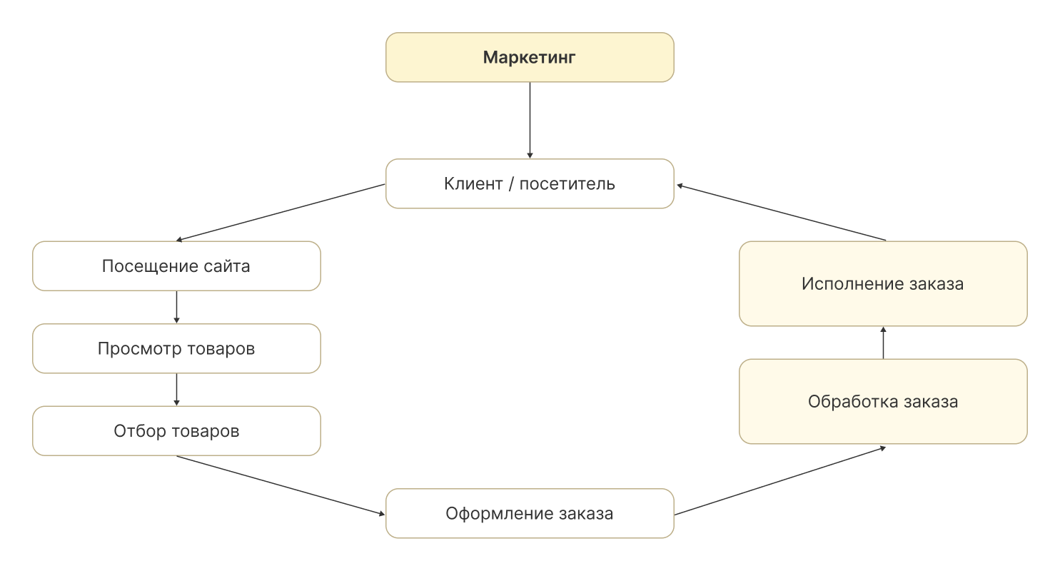 Всё начинается с маркетинга: реклама, рекомендации и контент приводят человека на сайт. Он изучает ассортимент, сравнивает предложения и выбирает товар.