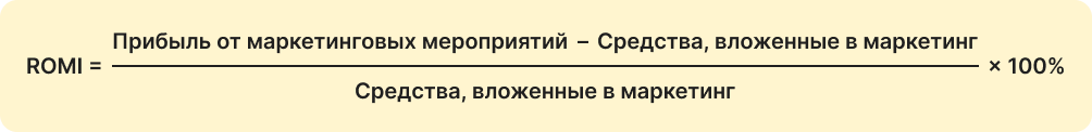 ROMI, или Return on Marketing Investment — это коэффициент возврата инвестиций в рекламу. Его смотрят, чтобы оценить эффективность всех маркетинговых каналов. Учитывают всё: участие в акциях, баннеры у торговых центров, мероприятия, онлайн-продвижение.