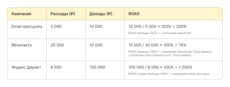 📌 Пример. Студия йоги запустила кампанию в Яндекс Директе. Бюджет на клики — 5 000 ₽, оплата специалисту за создание объявления — 3 000 ₽. Доход, который получили — 100 000 ₽, а маржа — 40%.