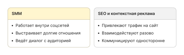 SMM часто путают с SEO и контекстной рекламой, но у него есть ключевое отличие — диалог и построение сообщества. Проще говоря: SEO и контекст «ловят» тех, кто ищет решение, а SMM — тех, кто ещё не знает о своей проблеме.