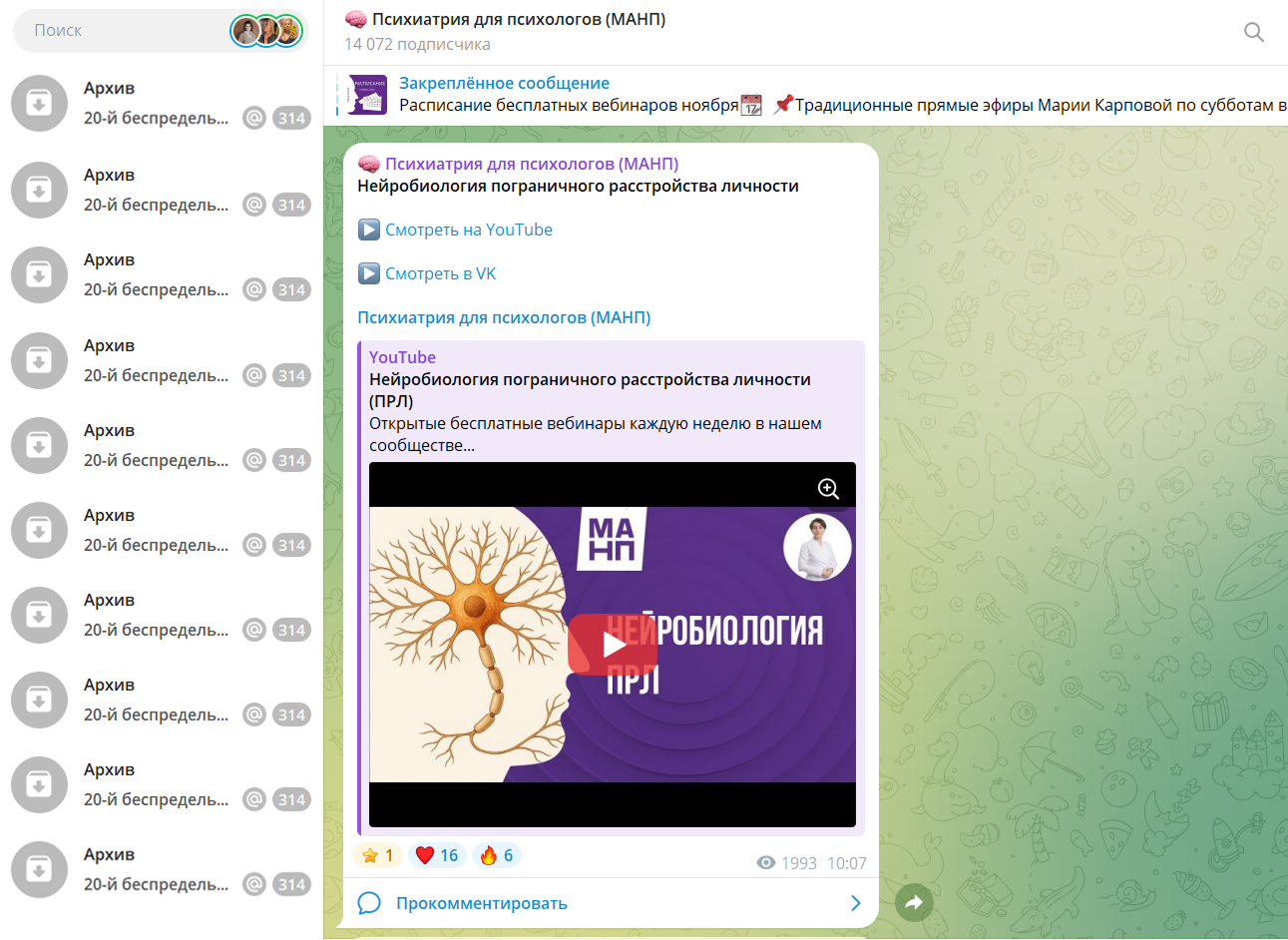 Образовательные эфиры: вебинары, лекции, конференции. Онлайн-школа для психологов МАНП каждую субботу проводить бесплатные вебинары в своём Telegram-аккаунте. Практикующий психиатр рассказывает о пограничных расстройствах, отвечает на вопросы и разбирает реальные кейсы. Эфиры помогают показать подход в действии, снять вопросы у аудитории и укрепить доверие к школе. Запись выкладывают в соцсети и переделывают под карточки.