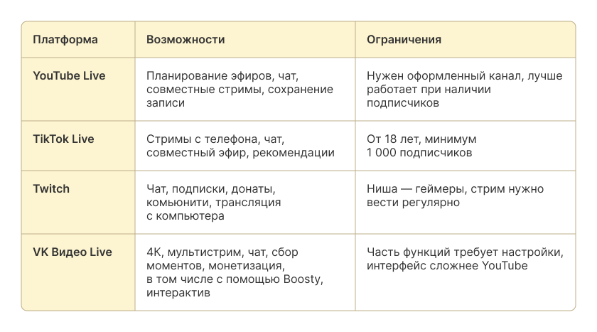Прямые эфиры можно проводить на специализированных площадках вроде Twitch, в соцсетях и мессенджерах. У каждой платформы — свои фишки, ограничения и технические нюансы.