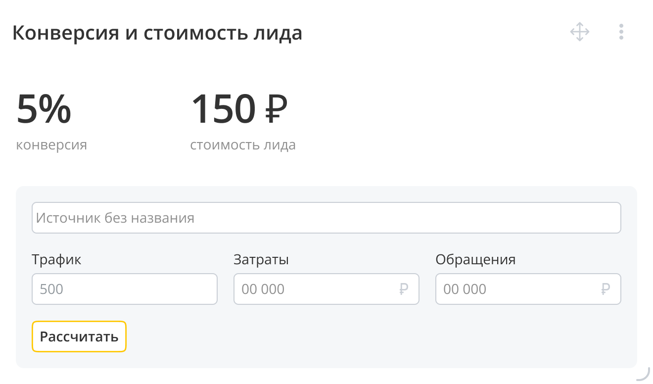 - Калькулятор конверсии и CPL: быстро считает стоимость обращения и цену лида для любого канала.