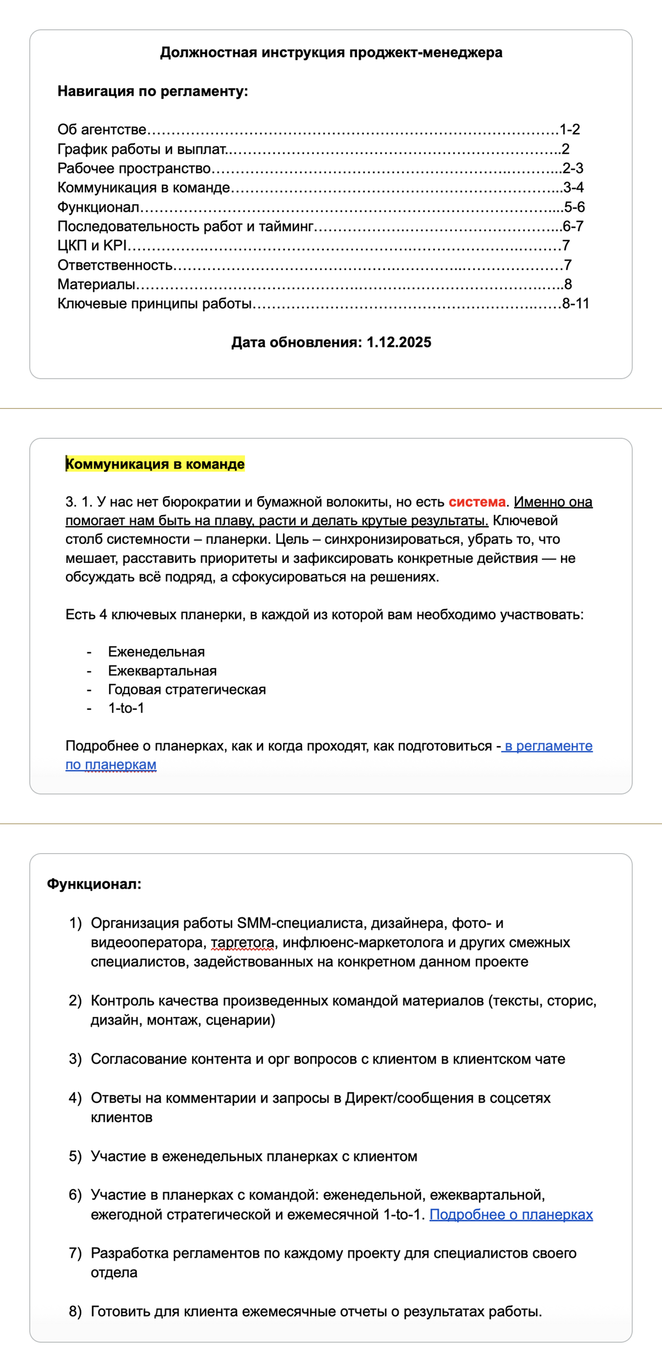 Мы создаём инструкции для каждой позиции, даже для проектных специалистов — дизайнера, видеооператора, фотографа. В документе фиксируем: