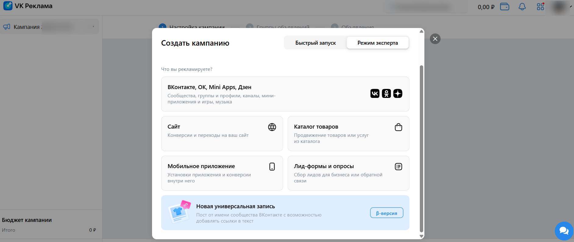 - Настройка кампании. Рекламодатель задаёт цель кампании — клики, охват или лиды. Также он указывает бюджет и параметры аудитории. Далее алгоритмы соцсети ищут таких людей в своей базе и показывают им объявления.