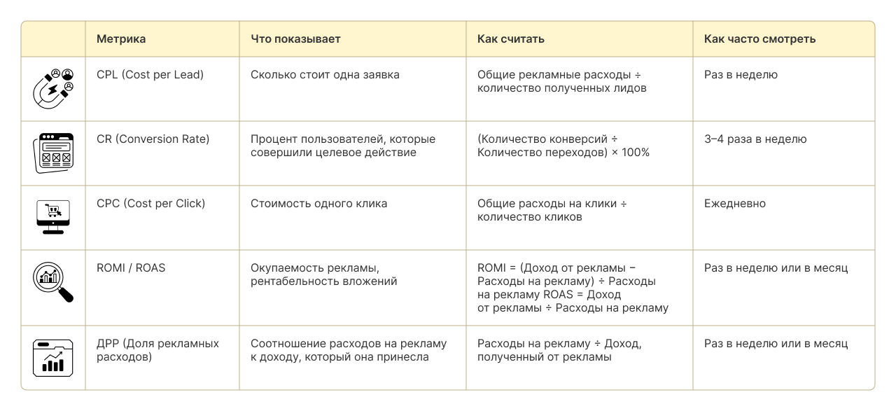Если реклама приносит примерно 30 заявок, как планировала студия, значит, таргет работает. Если их 15–20, или каждая заявка обходится дороже 3 000–3 500 ₽, это значит, что кампанию нужно корректировать.