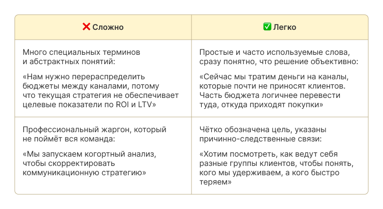 Объяснять сложное простым языком. Даже если вы используете сложные формулы и расчёты, объяснять их нужно так, чтобы понял новичок. Без этого не получить поддержки от руководства, не убедить коллег и не защитить бюджет. В таблице показываем разницу на примерах.