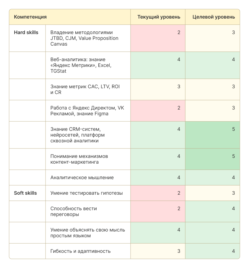 Hard skills растут через ответственность и реальный результат. Если маркетолог хочет прокачать аналитику, ему нужно работать с данными и бизнес-метриками: CAC, LTV, ROMI, маржинальностью, конверсией по этапам воронки.