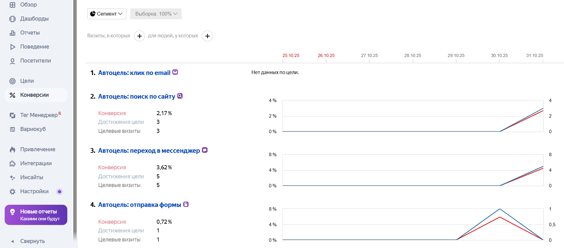 Для анализа конверсии в Метрике важно настроить цели — действия пользователей, которые бизнес считает результативными. Это может быть оформление заявки, подписка на рассылку или переход в соцсети бренда.