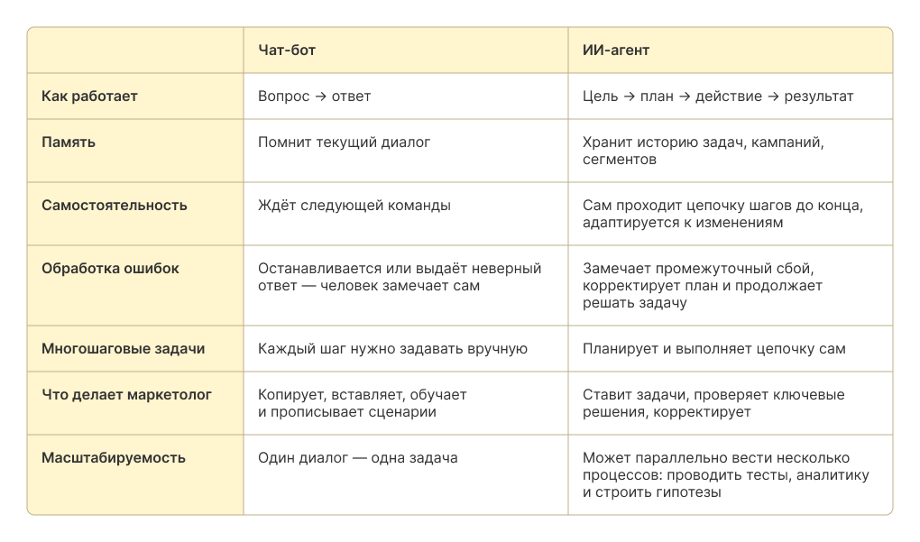Может ли ИИ-агент заменить маркетолога? Агент хорошо справляется с рутинными задачами: сегментацией базы, рассылками, отчётами и так далее. Но есть задачи, которые он не может взять на себя полностью: позиционирование, работа с нестандартными ситуациями, понимание культурного контекста, живое взаимодействие с аудиторией. ИИ не умеет принимать решения там, где нужна интуиция и эмпатия.