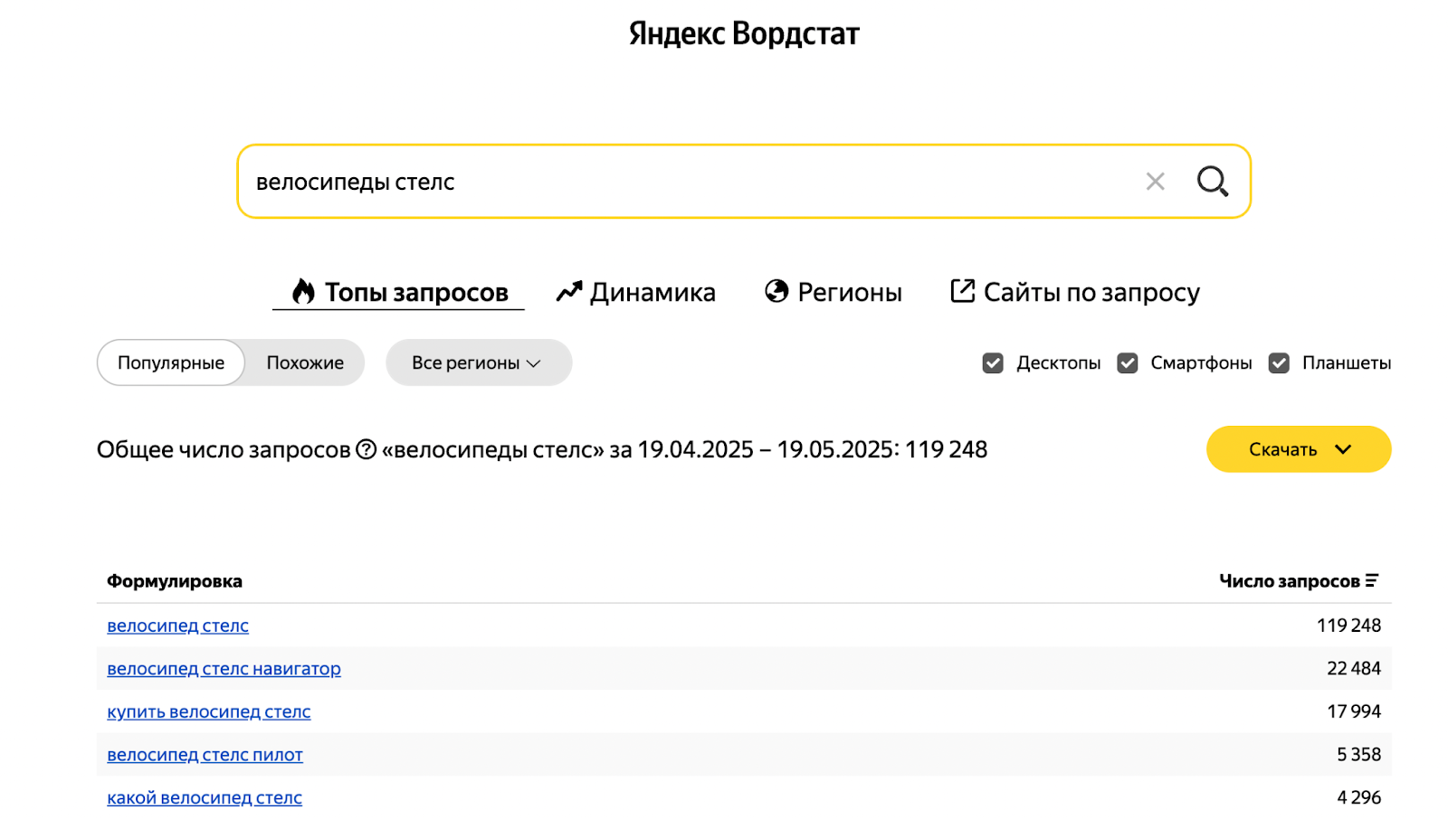 Яндекс.Вордстат подойдет для базовой оценки спроса и поиска популярных формулировок. Это бесплатный сервис — он показывает те же метрики, что и «Аналитика спроса» на Авито, но в масштабах всего поиска в Яндексе.