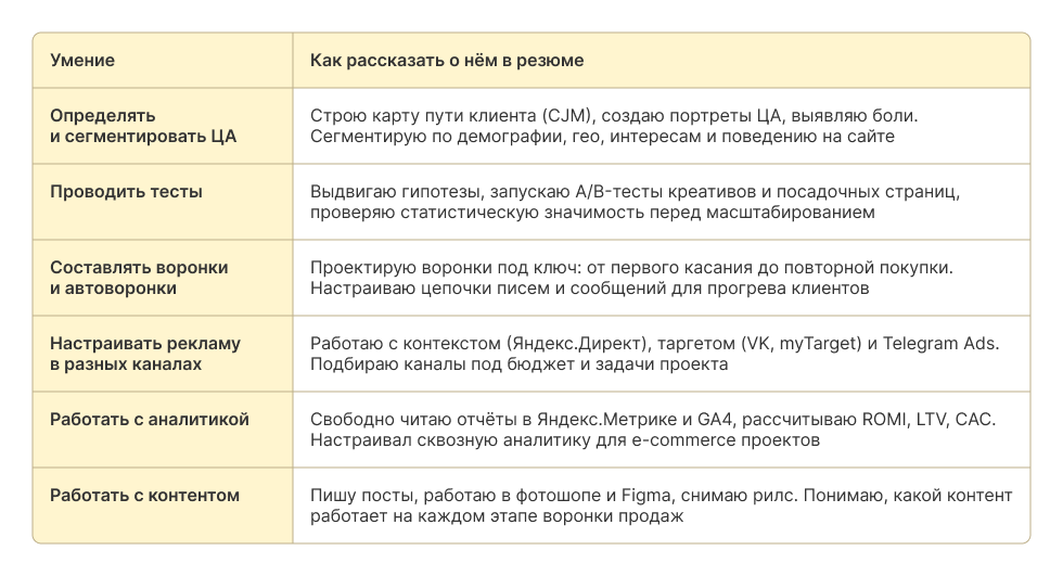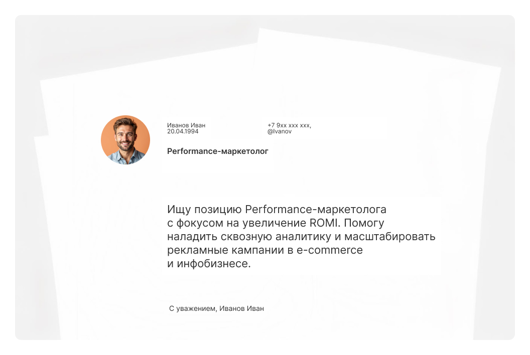 Например, если в объявлении указан «Performance-маркетолог», лучше использовать именно эту формулировку, а не общие «Трафик-менеджер» и «Интернет-маркетолог». Так вы сразу даёте понять, что внимательно прочитали объявление и релевантны этой позиции.