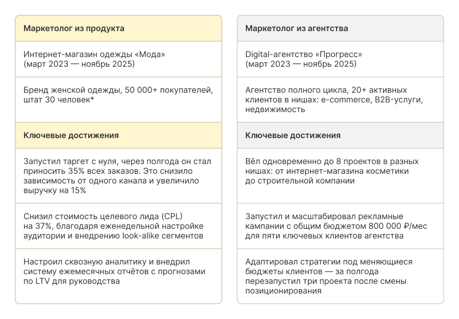 Опыт. Выбирайте проекты, которые перекликаются с задачами компании-рекрутера. Это принципиальный момент: продуктовые маркетологи и специалисты из агентства работают по-разному. Первые отвечают за рост конкретного продукта и фокусируются на стратегии, долгосрочных метриках и юнит-экономике. Вторые параллельно ведут проекты из разных сфер и постоянно вникают в новый бизнес.