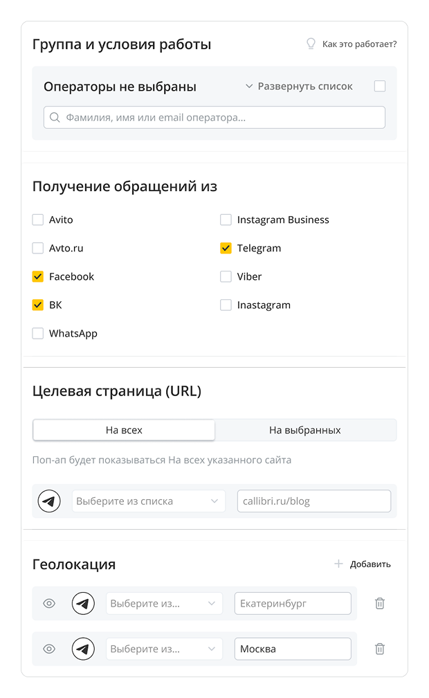 Группы операторов. Опция поможет не тратить время на ручное распределение чатов между разными филиалами, отделами или командами. Например, если человек отправит заявку из Москвы, она перейдёт коллегам из Московского офиса, а не регионального. Или он напишет из определённого мессенджера — сообщение также получит один из заранее выбранных менеджеров.