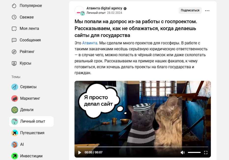 История с допросом по госпроекту. Она зашла благодаря драматичному заходу: слово «допрос» само по себе вызывает эмоцию, а обещание «как не облажаться» даёт полезный контекст. В материале есть и личная история команды, и практические советы для бизнеса — именно этот баланс сторителлинга и экспертности сделал статью вирусной.