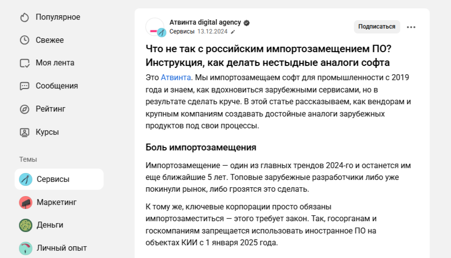 Тема импортозамещения ПО. Здесь идёт отработка повестки: все обсуждают переход на отечественные решения. Автор подал материал не сухо, а с иронией, и привёл конкретные рекомендации. Статья не просто анализирует рынок, а даёт читателю инструменты, как делать продукты лучше.