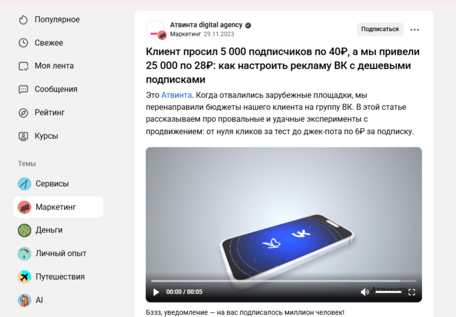 Кейc про подписчиков. Заголовок — фактически готовый мини-кейс: есть запрос, результат и конкретные цифры. Читатель сразу понимает, что внутри будет пошаговая инструкция, как снизить цену подписчика. И действительно, статья наполнена цифрами, примерами и практическими выводами — именно такой «прикладной» контент ценят маркетологи и предприниматели.