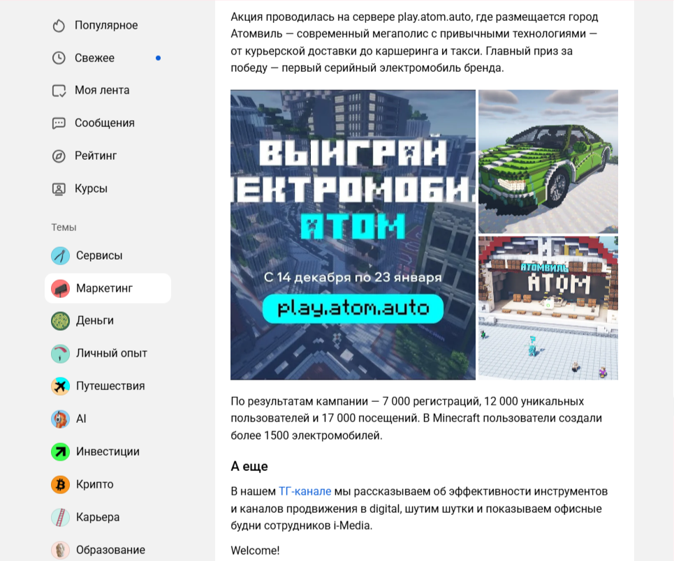 Совет: агентствам лучше публиковать тексты от лица конкретных людей — руководителей или специалистов. Такие статьи вызывают больше доверия и вовлечённости. И помните: никаких ссылок на корпоративные сайты, особенно с UTM-метками, — площадка их не приветствует. Максимум, что можно — предложить подписаться на личные соцсети автора.