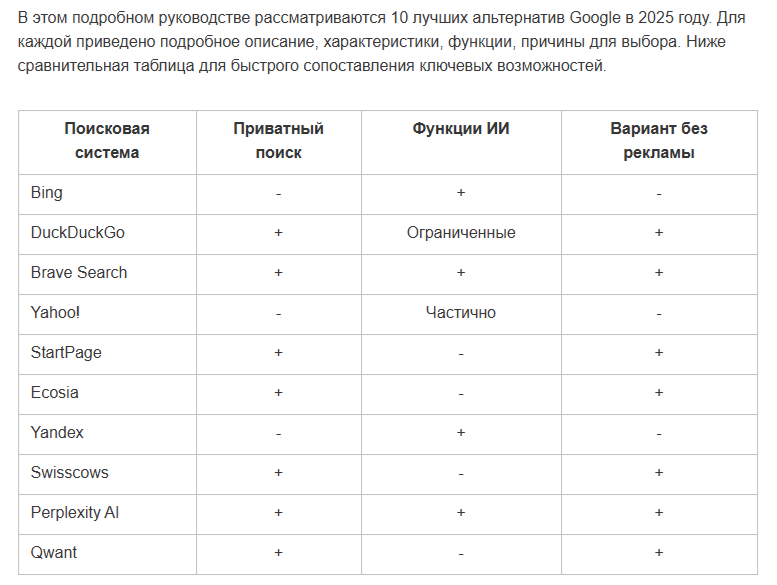 «10 лучших альтернатив Google в 2025 году». Главная проблема — «сырой» перевод. Повторы фраз, отсутствие адаптации под российскую аудиторию и сухая подача превращают материал в справочник. Упор на выводы сделал бы текст живее: какие поисковики полезны бизнесу, что сейчас работает в России.