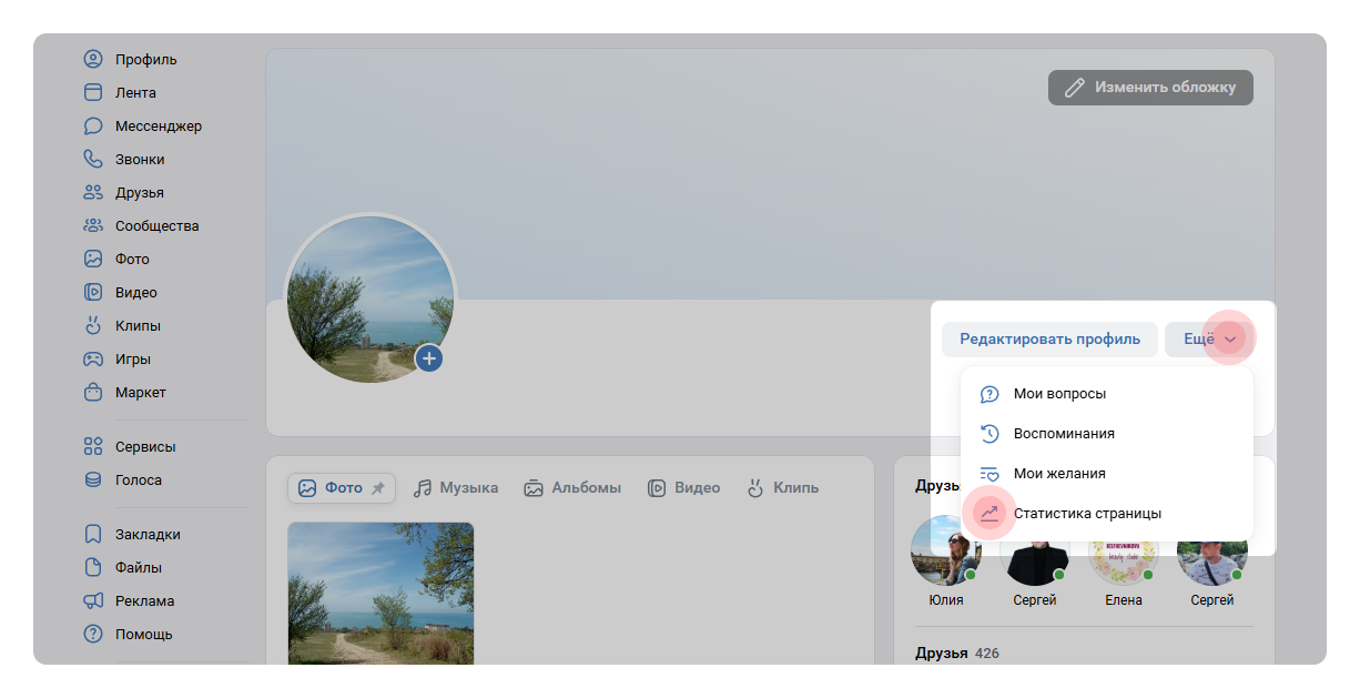 - В веб-версии: кликните на «Ещё» в правом верхнем углу профиля и выберите пункт «Статистика профиля».