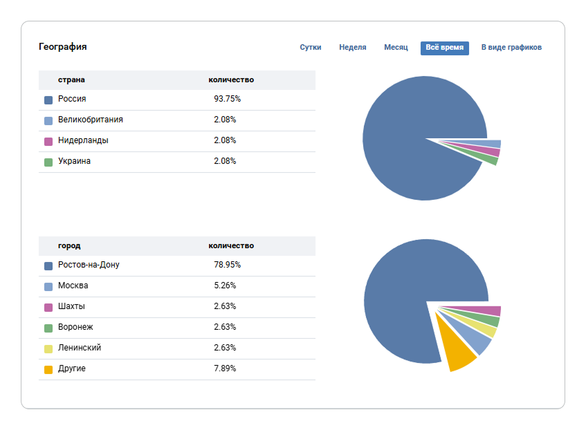 Активность — фиксирует, сколько раз ваши записи лайкали, репостили, комментировали или скрывали из новостей.