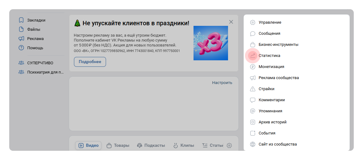 - Откройте вкладку «Статистика» в сообществе или профиле.