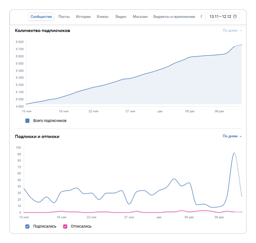 11 декабря маркетолог запустил рекламу, с которой пришло 92 новых участника. Количество отписок не выросло — значит, контент удовлетворил ожидания новой аудитории и она осталась в сообществе. Такой прирост помогает оценить, насколько продвижение реально работает и привлекает нужных подписчиков.