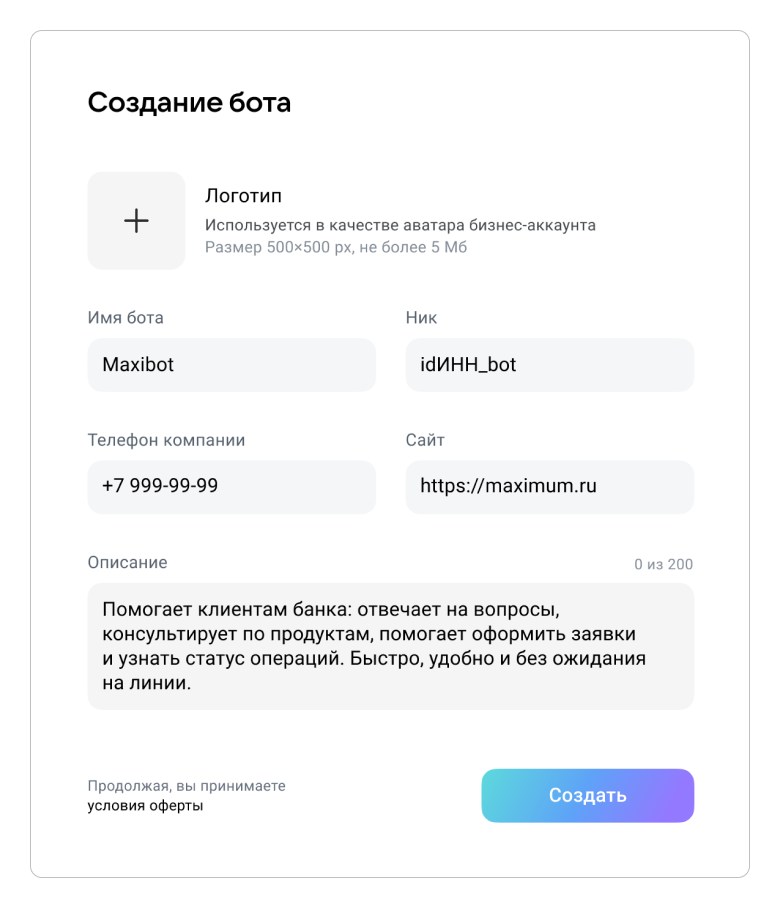 Шаг 2: заполните данные в карточке бота — всего в ней шесть полей. Необязательно заполнять только строку с номером телефона.