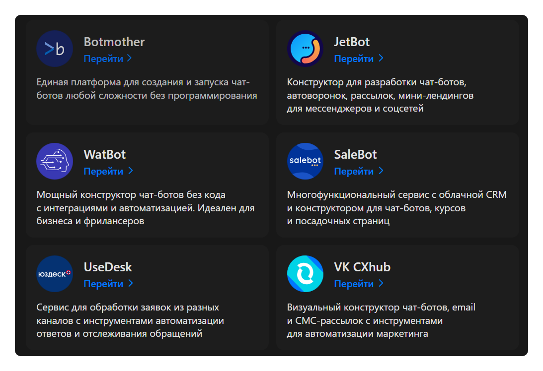 Чтобы не писать сценарий с нуля, возьмите готовый шаблон — для записи на приём, квиза, расписания тренировок и прочего. Для этого подключите любой партнёрский конструктор: BotMother, JetBot, WatBot, SaleBot, UseDesk, VKCXhub. Все они работают с Max и не требуют знаний кода.