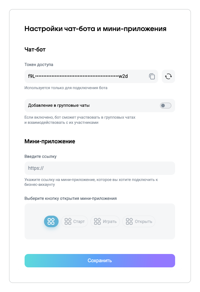 Шаг 3: нажмите «Создать», когда заполните все поля. После этого виртуальный помощник отправится на модерацию. Если всё в порядке, в разделе «Чат-бот и мини-приложение» выберите «Настроить». В поле с одноимённым названием появится токен — это уникальный ключ, благодаря которому бот будет работать на платформе MAX.