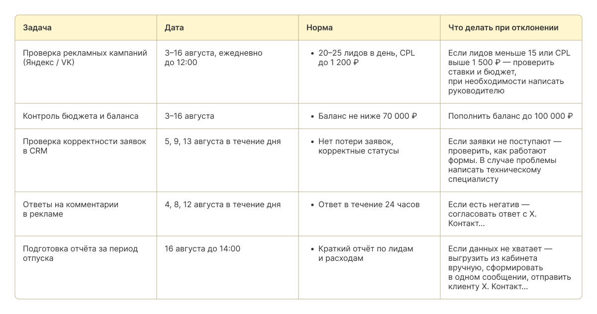 Поскольку времени на полноценную передачу задач обычно нет, сосредоточьтесь на критичном. Зафиксируйте текущие показатели: сколько заявок приходит в день, какой CPL считается нормой и прочее. Назначьте человека, который будет проверять кампании, и чётко обозначьте: в такой-то ситуации нужно связаться с вами, а такой-то — можно действовать самостоятельно.