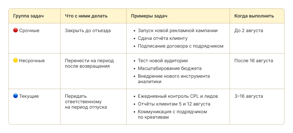 - Несрочные — их можно отложить до возвращения: тест новых аудиторий, масштабирование бюджета, внедрение инструмента.