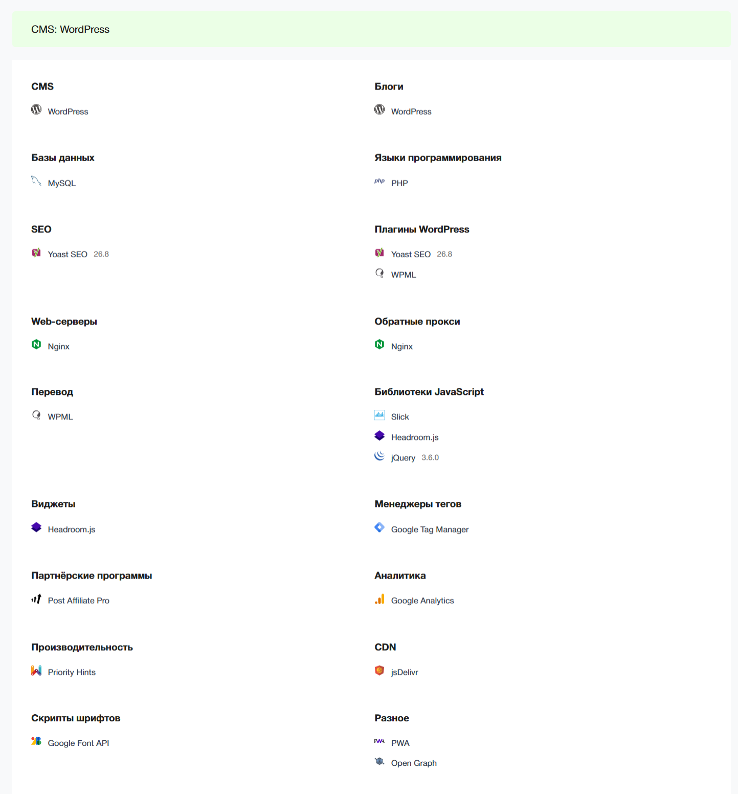 PR-CY — если нужно заглянуть под капот сайта. Это большой агрегатор инструментов для SEO-специалистов, есть и детектор CMS. Помимо информации об админке, выдаёт длинный список технологий, на которых держится сайт — фреймворки JavaScript, подключённые сервисы аналитики и много чего ещё.