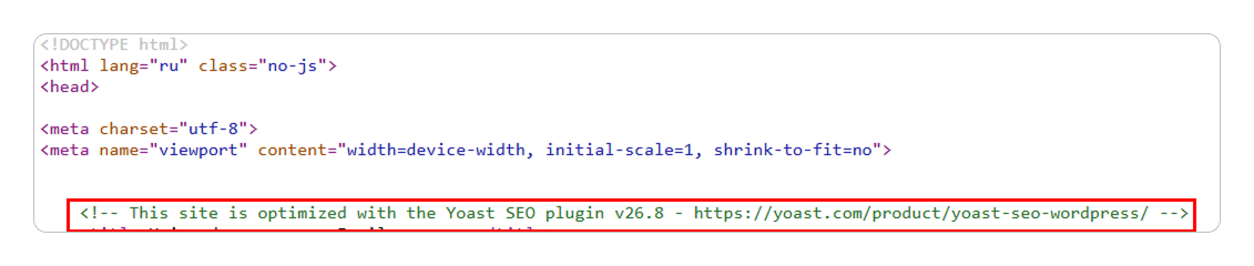 - Содержимое <head>. В метатегах внутри <head> будут упоминаться системные папки и адреса CMS — например, wp-content в коде сайтов на WordPress.