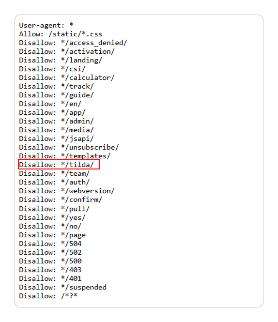 Чтобы определить CMS сайта, изучите все строки, которые начинаются с Disallow. Это список разделов сайта, которые должны быть скрыты от поисковых роботов. В этом списке будут и системные папки CMS. Например, так выглядит список закрытых от поиска страниц сайта на Tilda.