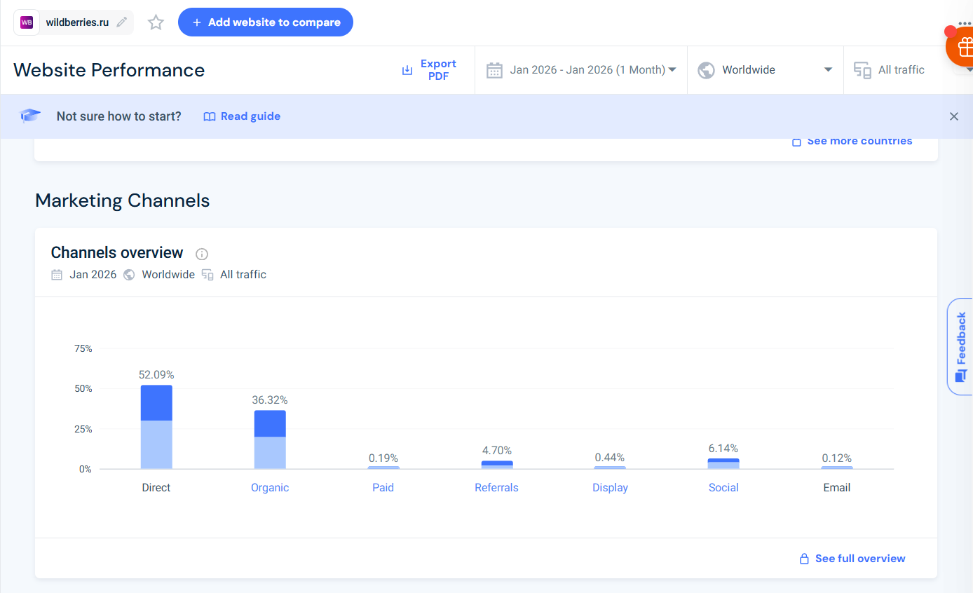 SimilarWeb показывает примерное число визитов за месяц, их динамику и распределение по каналам — поиск, реклама, социальные сети, прямые заходы и внешние ссылки. По этим данным оценивают, кто из конкурентов получает больше трафика, за счёт каких каналов он растёт и как меняется интерес к сайту со временем.
