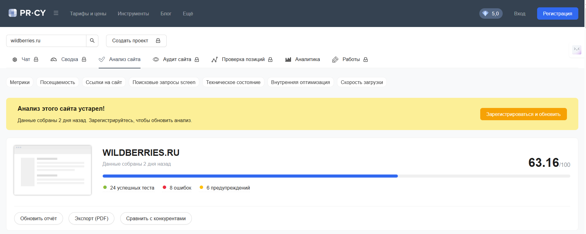 PR-CY — российский сервис для оценки состояния сайта. Он показывает позиции по ключевым словам и основные технические параметры: скорость загрузки, адаптивность, метатеги, ошибки в коде. Дополнительно в нём есть инструменты для проверки контента, индексации страниц и определения CMS, а также массовая проверка доменов и технический мониторинг с уведомлениями о проблемах.