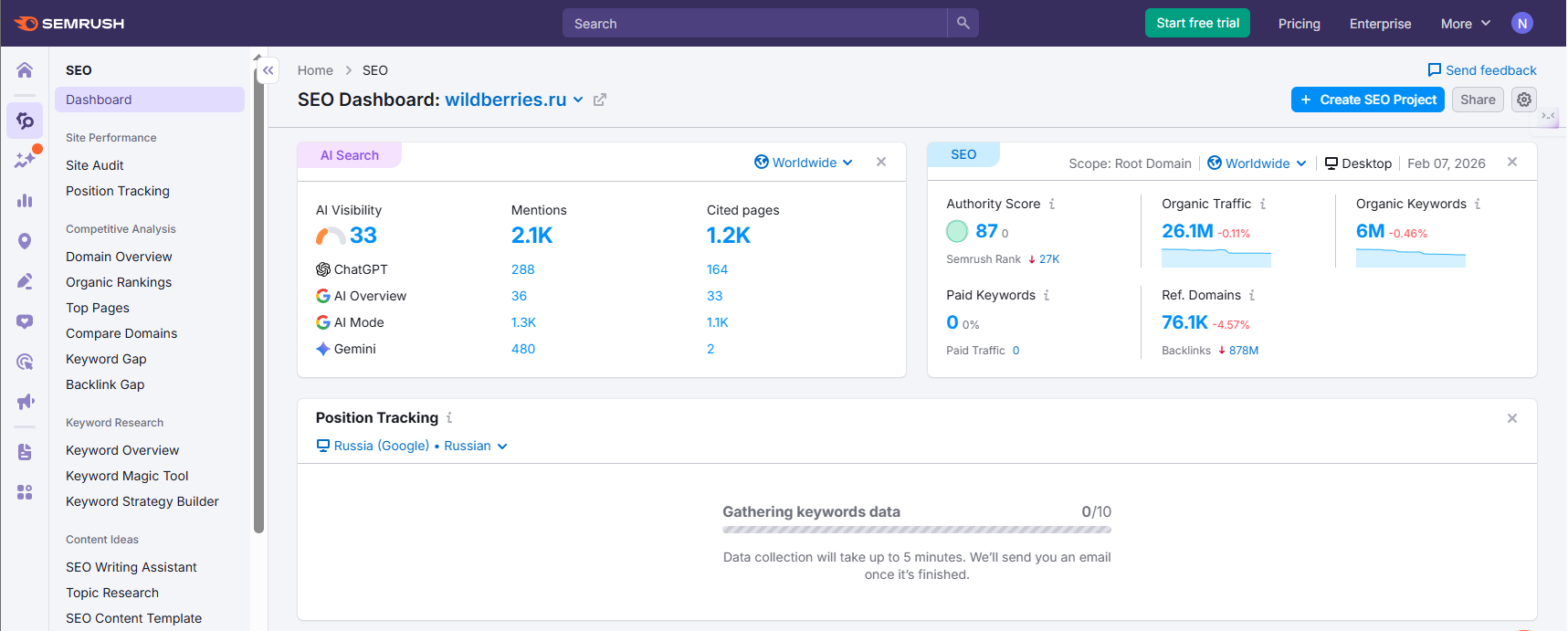 SEMrush — инструмент для анализа зарубежных рынков, в первую очередь Европы и США. Сервис показывает, по каким поисковым запросам сайт появляется в выдаче, какие страницы получают трафик и из каких источников он приходит — из поиска, рекламы или соцсетей. Также можно посмотреть распределение аудитории по странам, динамику посещаемости, поведение пользователей, список похожих сайтов и ключевые слова конкурентов.
