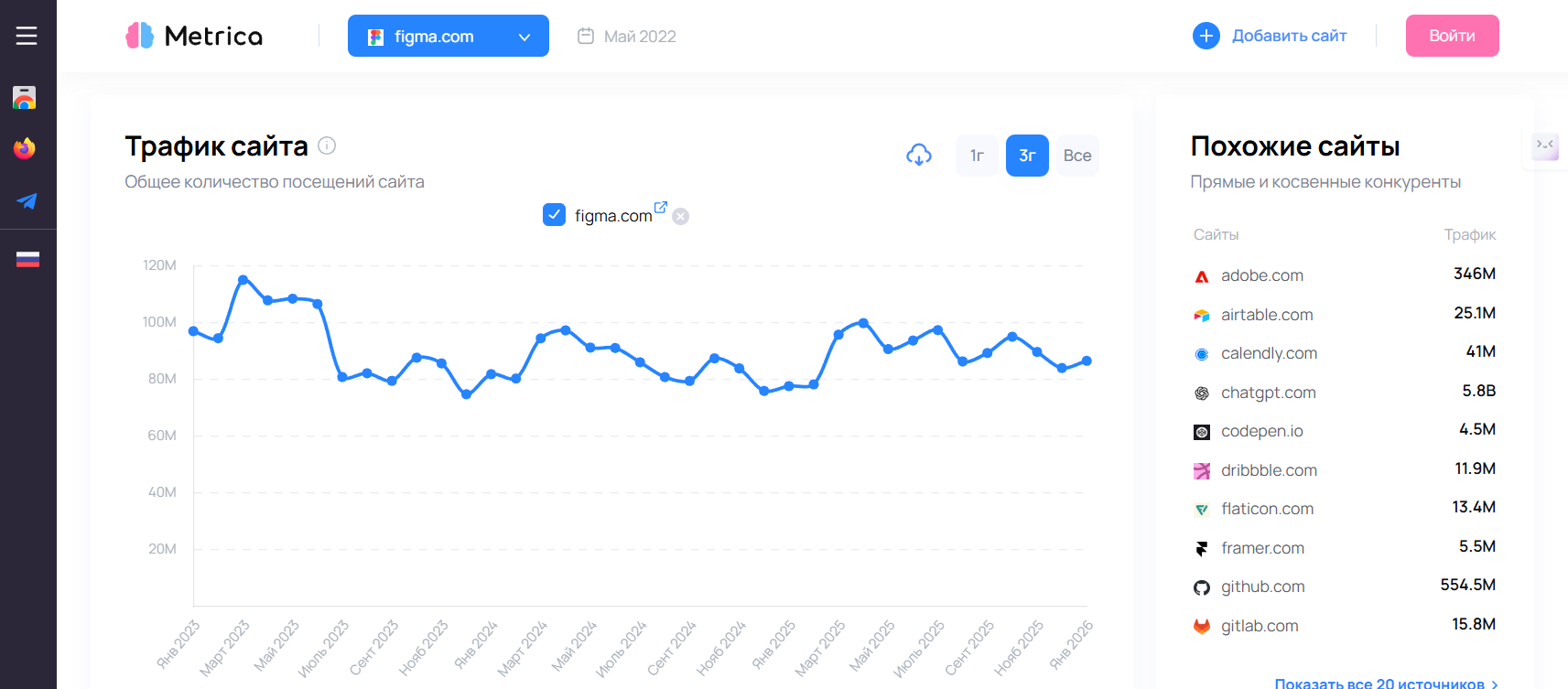 Metrica Guru показывает примерное число визитов в месяц, динамику трафика за несколько лет и распределение аудитории по регионам. Также можно сравнивать несколько сайтов на одном экране и видеть, кто из конкурентов крупнее по объёму трафика. Сервис используют, чтобы оценить масштаб проекта — детальной разбивки по источникам и поведению пользователей здесь нет.