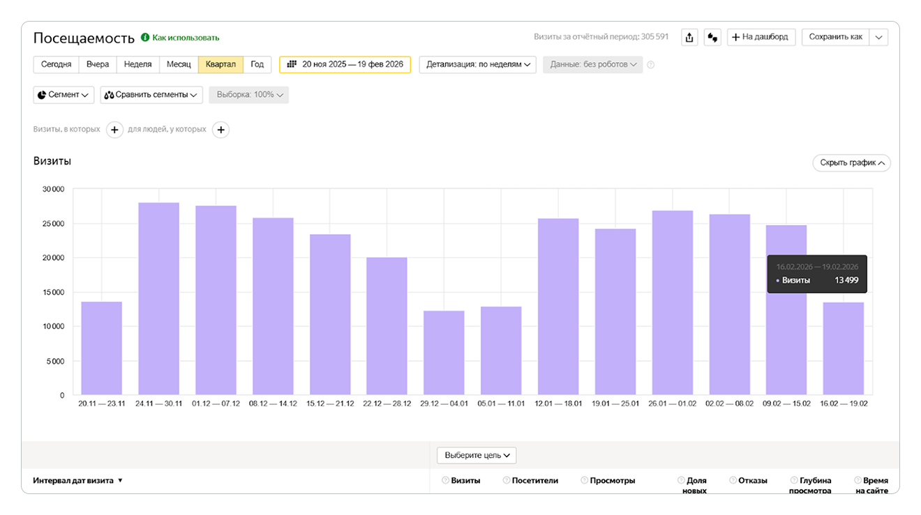 В Яндекс Метрике статистика отображается в разделе «Отчёты» и доступна за выбранный период. Короткие интервалы покажут резкие изменения, например, рост посещаемости после запуска рекламы или её падение в отдельные дни. Длинные — повторяющиеся сценарии в поведении аудитории, включая сезонные колебания.
